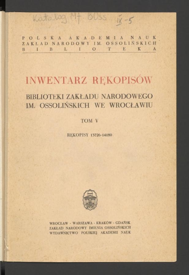 | Inwentarz rękopisów Biblioteki Zakładu Narodowego im. Ossolińskich we Wrocławiu. Tom 5, Rękopisy 13726-14180 | Sep 11, 2025 |