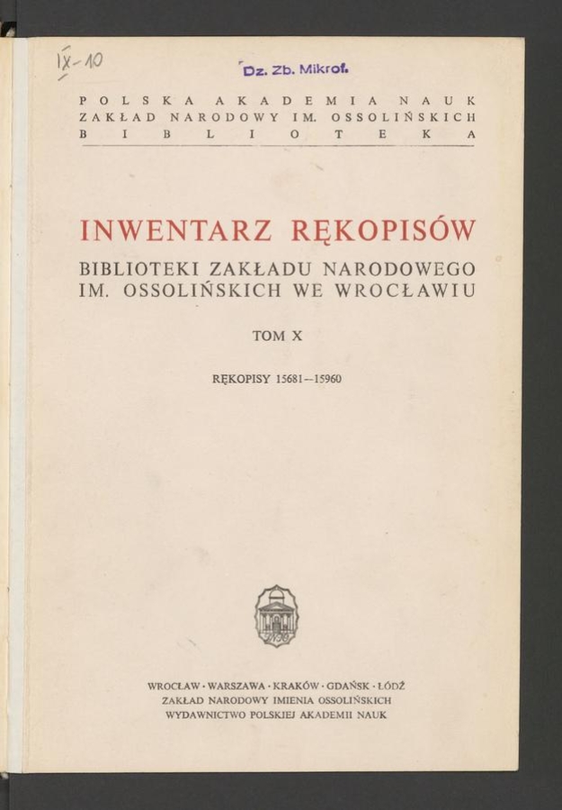 | Inwentarz rękopisów Biblioteki Zakładu Narodowego im. Ossolińskich we Wrocławiu. Tom 10, Rękopisy 15681-15960 | Sep 11, 2025 |